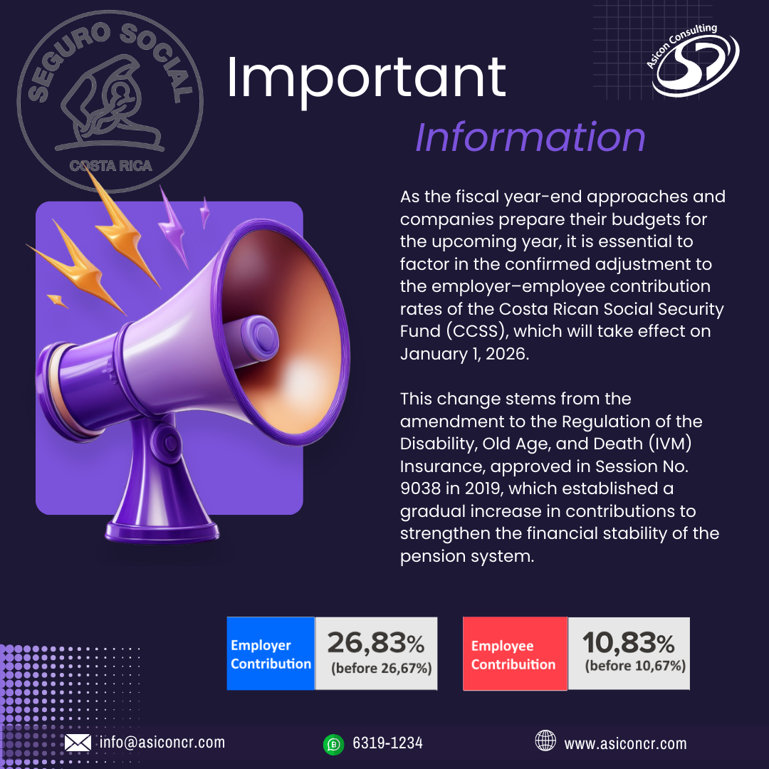 The worker–employer contribution rate is being modified due to the need to strengthen the financial sustainability of the Disability, Old-Age and Death (IVM) insurance regime administered by the CCSS. Costa Rica is experiencing a decline in the active workforce and an increase in the number of retirees, which places pressure on the pension system. To ensure the fund can meet its future obligations without compromising its long-term stability, the CCSS implemented a gradual adjustment in contributions that will take effect as of January 2026.