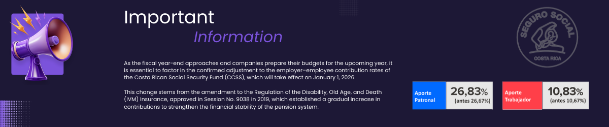 Starting January 1, 2026, a new adjustment to the worker–employer contribution rates of the Costa Rican Social Security Fund (CCSS) will come into effect. This update is part of a gradual process aimed at strengthening the stability of the Disability, Old-Age, and Death (IVM) regime. The increase responds to the need to ensure the long-term sustainability of the pension system in a national context where the active working population has been decreasing relative to the number of retirees or individuals nearing retirement. Given this scenario, the CCSS has implemented a staggered scheme of increases to strengthen the fund’s revenues without creating an abrupt impact on labor costs.