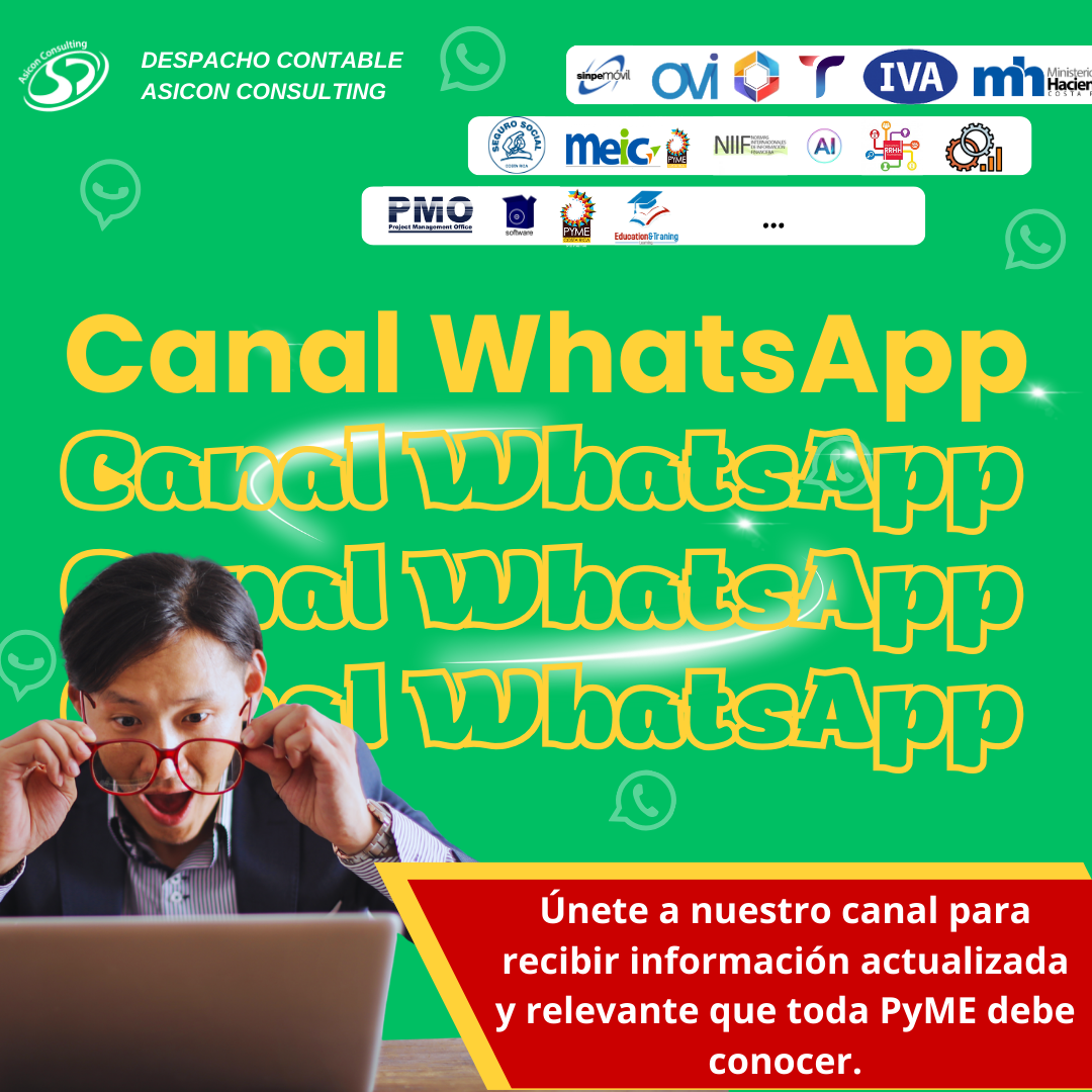 Conscientes de esta realidad, en Asicon Consulting hemos creado nuestro Canal de WhatsApp, un espacio diseñado para brindar información clara, oportuna y relevante sobre los principales cambios y notificaciones que toda empresa —y especialmente las PyMEs— debe conocer. A través de este canal compartimos actualizaciones sobre seguridad social, cargas laborales, impuestos, plazos, salarios base, NIIF, NIC, tecnología aplicada a la gestión empresarial, proyectos y otros temas clave para la toma de decisiones.